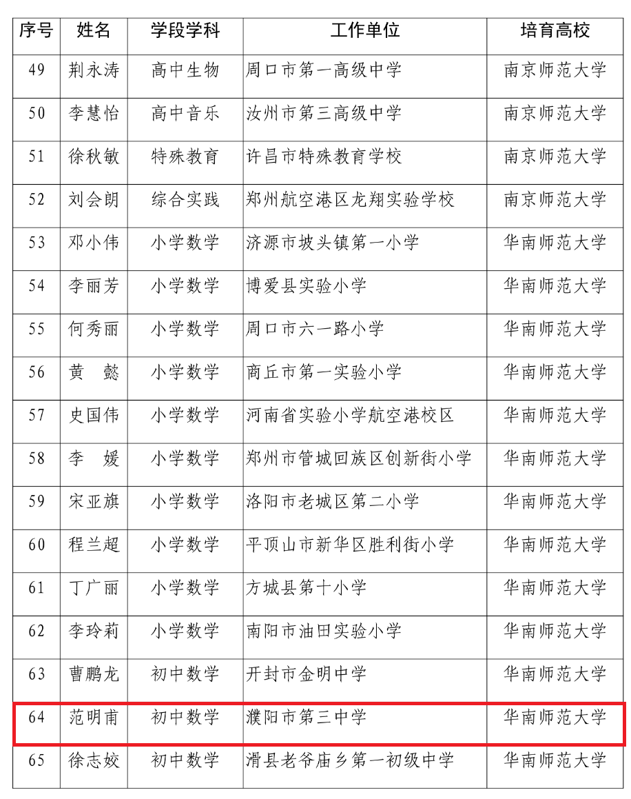 近日,河南省教育厅正式公布 2023—2025 年度中原名师认定结果,我区共有3名教师凭借扎实的专业素养、突出的教学业绩成功入选,分别是濮阳市实验小学窦明奇、濮阳市第一中学李惠珍、濮阳市第三中学范明甫。